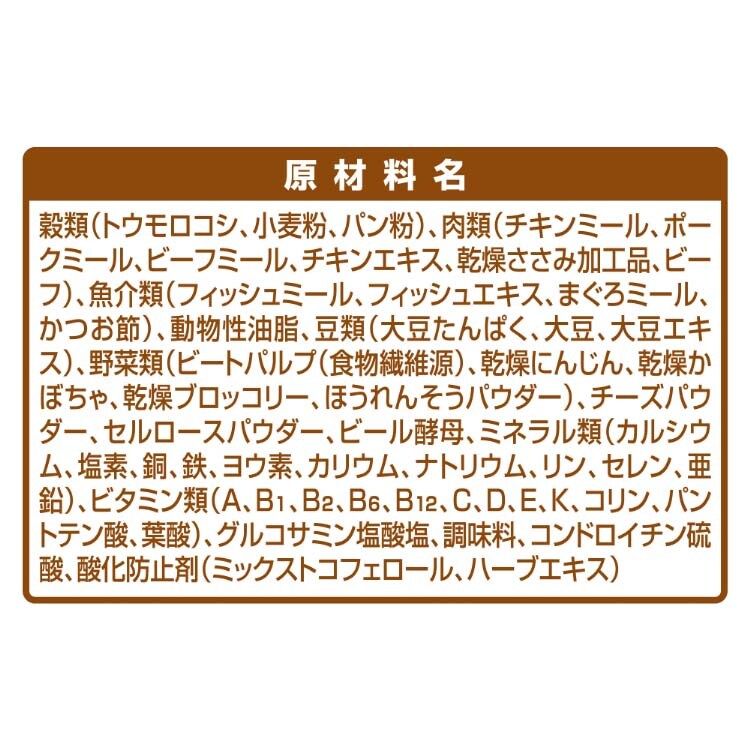 | 穀類(トウモロコシ、小麦粉、パン粉)、肉類(チキンミール、ポークミール、ビーフミール、チキンエキス、乾燥ささみ加工品、ビーフ)、魚介類(フィッシュミール、フィッシュエキス、まぐろミール、かつお節)、動物性油脂、豆類(大豆たんぱく、大豆、大豆エキス)、野菜類(ビートパルプ(食物繊維源)、乾燥にんじん、乾燥かぼちゃ、乾燥ブロッコリー、ほうれんそうパウダー)、チーズパウダー、セルロースパウダー、ビール酵母、ミネラル類(カルシウム、塩素、銅、鉄、ヨウ素、カリウム、ナトリウム、リン、セレン、亜鉛)、ビタミン類(A、B1、B2、B6、B12、C、D、E、K、コリン、パントテン酸、葉酸)、グルコサミン塩酸塩、調味料、コンドロイチン硫酸、酸化防止剤(ミックストコフェロール、ハーブエキス) |