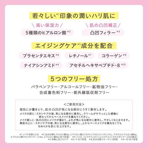 | ジメチコン、(ジメチコン/ビニルジメチコン)クロスポリマー、フェニルトリメチコン、ジメチコンクロスポリマー、シリカ、(ビニルジメチコン/メチコンシルセスキオキサン)クロスポリマー、ポリメタクリル酸メチル、PEG-9ポリジメチルシロキシエチルジメチコン、水、アスコルビン酸Na、アセチルヒアルロン酸Na、カカオ種子エキス、トコフェロール、ナイアシンアミド、ヒアルロン酸Na、ヒアルロン酸クロスポリマー-2-Na、ヒアルロン酸ヒドロキシプロピルトリモニウム、ビルベリー葉エキス、プラセンタエキス、ペンチレングリコール、レチノール、加水分解コラーゲン、加水分解ヒアルロン酸Na、BG、PEG-10ジメチコン、PEG-40水添ヒマシ油、アセチルヘキサペプチド-8、イソセテス-10、イソセテス-25、カプリリルグリコール、ジフェニルシロキシフェニルトリメチコン、トリ(カプリル酸/カプリン酸)グリセリル、トリエトキシカプリリルシラン、トリメチルシロキシケイ酸、エチルヘキシルグリセリン、フェノキシエタノール、酸化チタン、酸化鉄、水酸化Al |