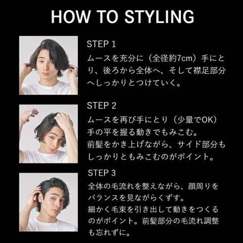 ・適量を手のひらにとり、両手に広げてから固めたい部分に塗布し、なじませながら形づけします。塗布した後ドライヤーで乾かすと、スタイルが決まりやすくなります。