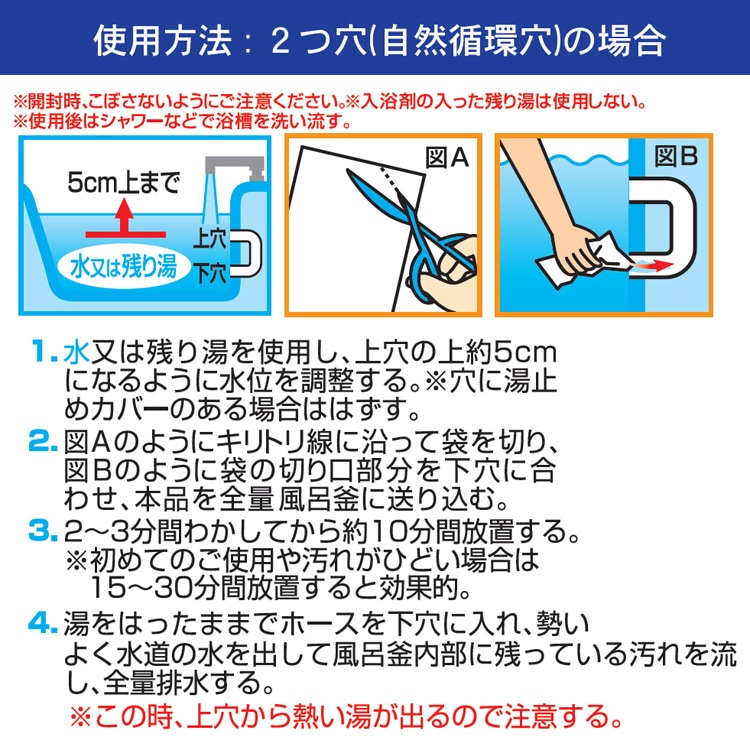 (2)袋の端をキリトリ線にそって切り、袋の切り口部分を下穴に合わせ、本品を全量風呂釜に送り込む。