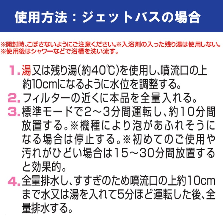 (1)湯又は残り湯(約40度)を使用し、噴流口の上約10cmになるように水位を調整する。