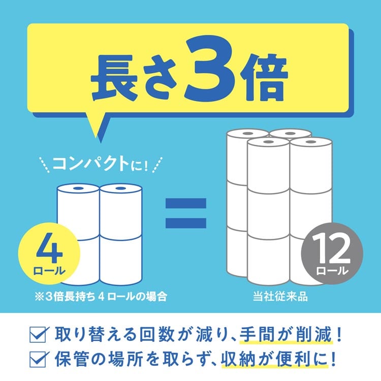 ●1ロールで3ロール分だから、取り替えの回数が減り、収納スペースも1/3に収まります。