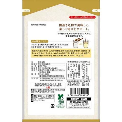 ●国産丸大豆「とよまさり」100%使用。甘みのある大豆を香ばしく焙煎し、皮をむいて粉末にすることで、なめらかな口当たりを実現しました。