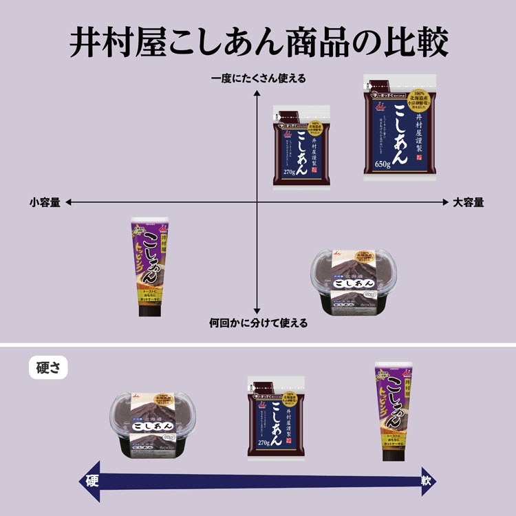 ●パンに塗りやすく、アイスクリームやお菓子のトッピングとしても使いやすいスプレッド性のあるこしあんに仕上げました。