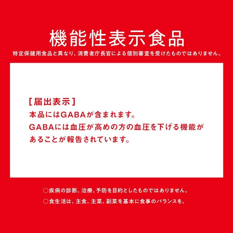届出表示:本品にはGABAが含まれます。GABAには血圧が高めの方の血圧を下げる機能があることが報告されています。