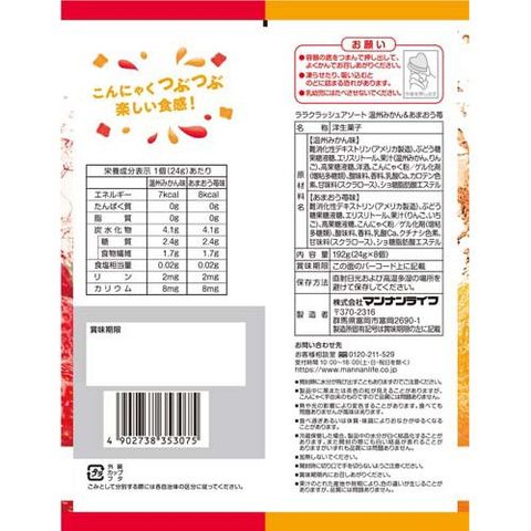 | ★温州みかん味 難消化性デキストリン(アメリカ製造)、ぶどう糖果糖液糖、エリスリトール、果汁(温州みかん、りんご)、高果糖液糖、洋酒、こんにゃく粉/ゲル化剤(増粘多糖類)、酸味料、香料、乳酸Ca、カロテン色素、甘味料(スクラロース)、ショ糖脂肪酸エステル ★あまおう苺 難消化性デキストリン(アメリカ製造)、ぶどう糖果糖液糖、エリスリトール、果汁(りんご、いちご)、高果糖液糖、こんにゃく粉/ゲル化剤(増粘多糖類)、酸味料、香料、乳酸Ca、クチナシ色素、甘味料(スクラロース)、ショ糖脂肪酸エステル |