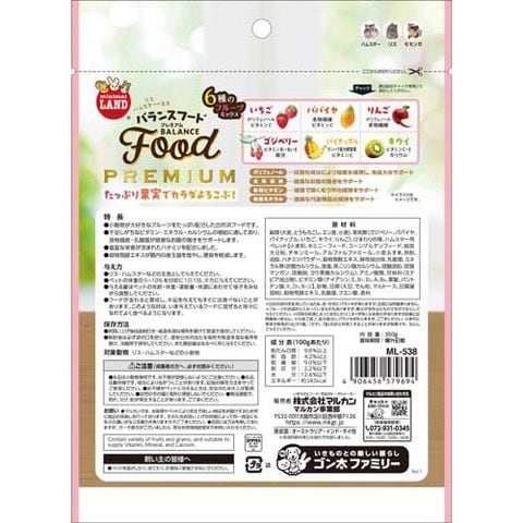 | 穀類(大麦、とうもろこし、エン麦、小麦)、果実類(ゴジベリー、パパイヤ、パイナップル、いちご、キウイ、りんご)、ひまわりの種、ハムスター用ペレット(小麦粉、ホミニーフィード、コーングルテンフィード、脱脂大豆粕、チキンミール、アルファルファミール、小麦ふすま、魚粉、油脂、ハチミツパウダー、穀物発酵エキス、酵母抽出物、乳酸菌、ミネラル類(炭酸カルシウム、食塩、第二リン酸カルシウム、硫酸亜鉛、硫酸マンガン、硫酸銅、ヨウ素酸カルシウム)、アミノ酸類、甘味料(ステビア抽出物)、ビタミン類(ナイアシン、E、B1、B2、 A、B6、葉酸、パントテン酸、K、D3、B12))、砂糖、豆腐(大豆、でん粉、マルトース、豆腐凝固剤)、穀物発酵エキス、乳酸菌、クエン酸、香料 |