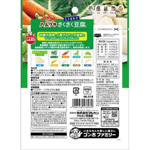 | 穀類(とうもろこし、大麦、エン麦、米)、野菜類(にんじん、ブロッコリーの葉)、えんどう豆、かぼちゃの種、豆腐(大豆、でん粉、マルトース、豆腐凝固剤)、ブドウ糖、穀物発酵エキス、乳酸菌 |