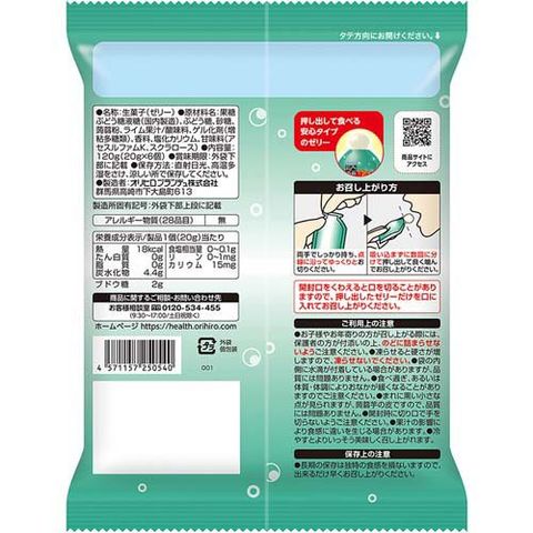 | 製品1個(20g)当たり 熱量:12.8kcal、たん白:0g、脂質:0-0.2g、炭水化物:3g、食塩相当量:0~0.1g、リン:0~2mg、カリウム:17mg |