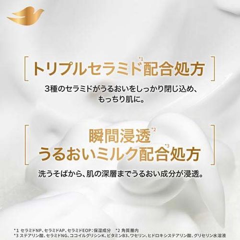 ●瞬間浸透※2 うるおいミルク※3、トリプルセラミド※4 配合。だから、お風呂上りもうるおい続く。