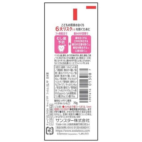 | ★基剤 ソルビット液 ★清掃剤 無水ケイ酸 ★助剤 還元パラチノース ★粘結剤 無水ケイ酸、CMC・Na ★発泡剤 アルキルグリコシド ★香味剤 香料(いちごタイプ)、サッカリンNa ★安定剤 酸化Ti ★薬用成分 フッ化ナトリウム(フッ素950ppm) ★pH調整剤 リン酸2Na、リン酸1Na |
