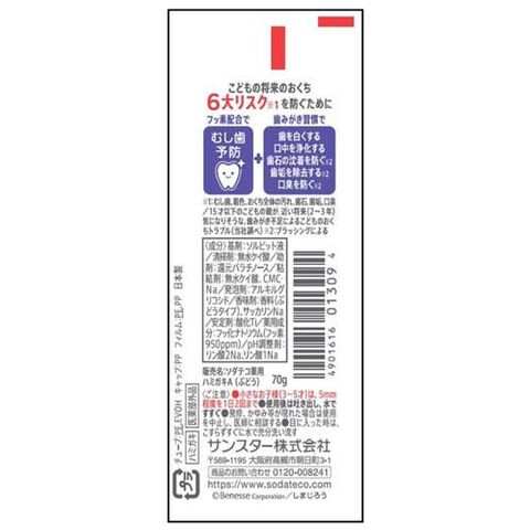 | ★基剤 ソルビット液 ★清掃剤 無水ケイ酸 ★助剤 還元パラチノース ★粘結剤 無水ケイ酸、CMC・Na ★発泡剤 アルキルグリコシド ★香味剤 香料(ぶどうタイプ)、サッカリンNa ★安定剤 酸化Ti ★薬用成分 フッ化ナトリウム(フッ素950ppm) ★pH調整剤 リン酸2Na、リン酸1Na |