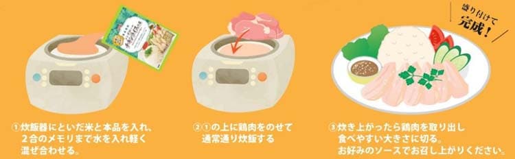 ・調理方法(2-3人分)材料:米2合、鶏もも2枚、本品1袋、水