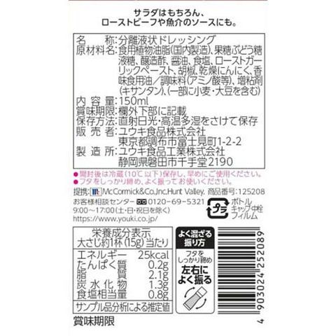 食用植物油脂(国内製造)、果糖ぶどう糖液糖、醸造酢、醤油、食塩、ローストガーリックペースト、胡椒、乾燥にんにく、香味食用油/調味料(アミノ酸等)、増粘剤(キサンタン)、(一部に小麦・大豆を含む)