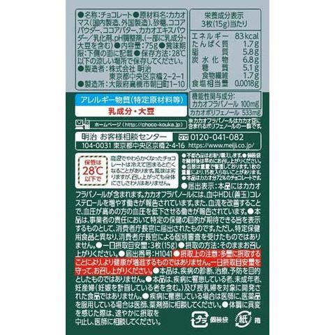 | 3枚(15g)当たり エネルギー:83kcal、たんぱく質:1.7g、脂質:5.8g、炭水化物:6.8g、糖質:5.1g、食物繊維:1.7g、食塩相当量:0.0018g、カカオポリフェノール:533mg 機能性関与成分 カカオフラバノール:100mg |