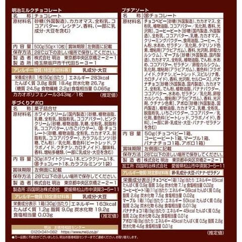 | 明治ミルクチョコレート:乳成分・大豆 手づくりアポロ:乳成分・大豆 プチアソート:卵・乳成分・大豆・バナナ・ゼラチン |