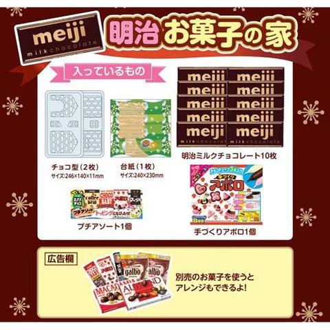 | 明治ミルクチョコレート(50g):10枚 プチアソート(50g):1個 手づくりアポロ(30g):1個 チョコ型(246×140×11mm):2枚 台紙(240×230mm):1枚 |