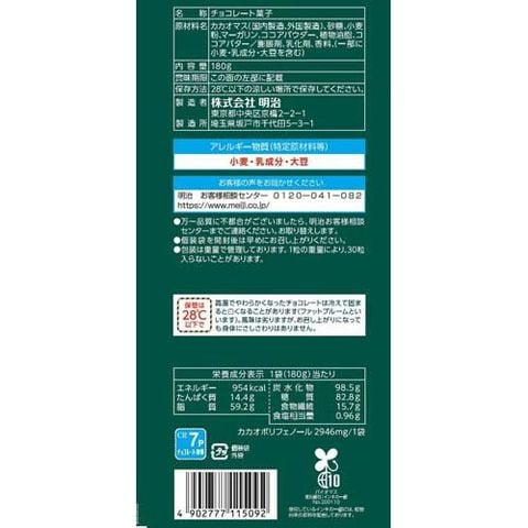 | 1袋(180g)当たり エネルギー:954kcal、たんぱく質:14.4g、脂質:59.2g、炭水化物:98.5g、糖質:82.8g、食物繊維:15.7g、食塩相当量:0.96g、カカオポリフェノール:2946mg/1袋 |