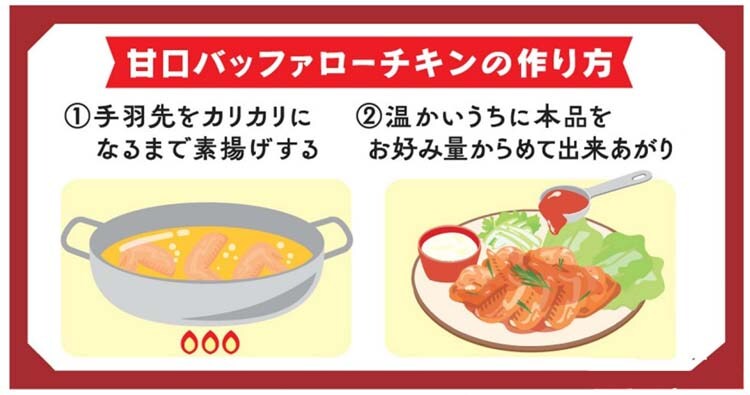●揚げたチキンに絡めるだけ。はちみつの甘みとスモーキーな香りの「甘口バッファローチキン」ができあがります。