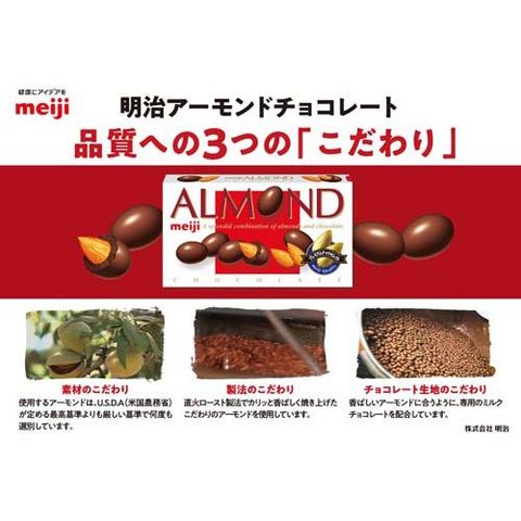 ●明治のプレミアムナッツセレクトアーモンドを直火ロースト製法でカリっと香ばしく焼き上げ、しっかり甘くミルク感のあるチョコレートでコーティングした。