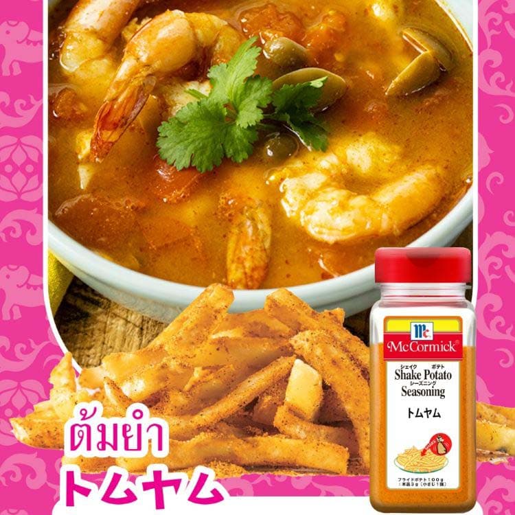 ●カフィアライムやレモングラスの効いた世界三大スープのひとつ「トムヤム」味のフライドポテトが楽しめる調味料です。