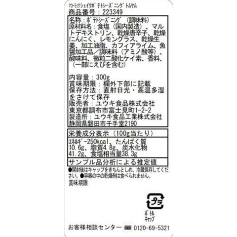 | 食塩(国内製造)、マルトデキストリン、乾燥唐辛子、乾燥にんにく、レモングラス、乾燥生姜、加工油脂、カフィアライム、魚醤加工品/調味料(アミノ酸等)、酸味料、微粒二酸化ケイ素、香料、(一部にえびを含む) |