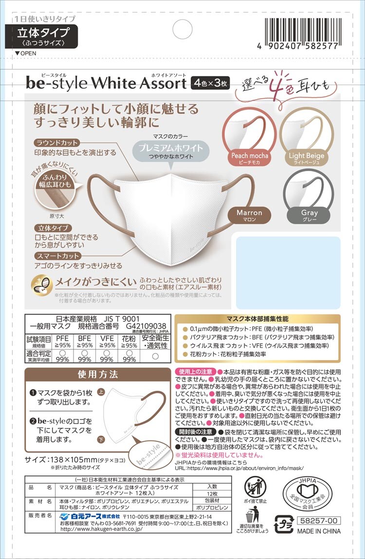 | ・ビースタイル ホワイトアソート 4色×3枚 マスクのカラー:プレミアムホワイト×耳紐のカラー:ピーチモカ×3枚 マスクのカラー:プレミアムホワイト×耳紐のカラー:ライトベージュ×3枚 マスクのカラー:プレミアムホワイト×耳紐のカラー:マロン×3枚 マスクのカラー:プレミアムホワイト×耳紐のカラー:グレー×3枚 |