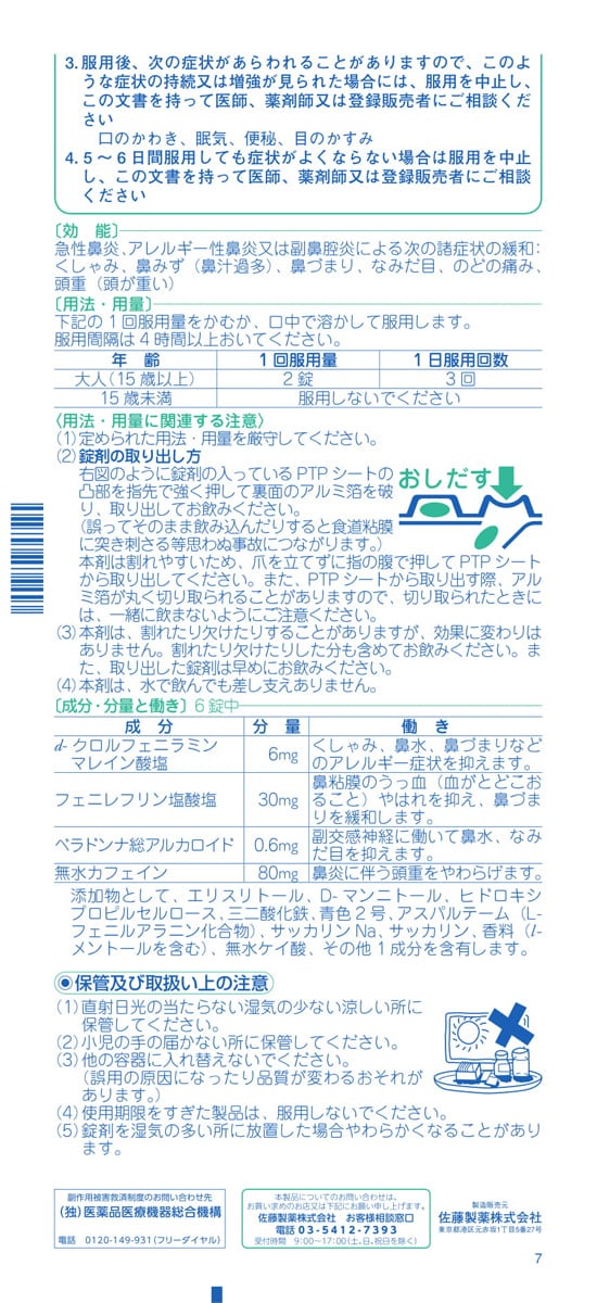 | (6錠中) d-クロルフェニラミンマレイン酸塩:6mg フェニレフリン塩酸塩:30mg ベラドンナ総アルカロイド:0.6mg 無水カフェイン:80mg 添加物として、エリスリトール、D-マンニトール、ヒドロキシプロピルセルロース、三二酸化鉄、青色2号、アスパルテーム(L-フェニルアラニン化合物)、サッカリンNa、サッカリン、香料(L-メントールを含む)、無水ケイ酸、その他1成分を含有します。 |