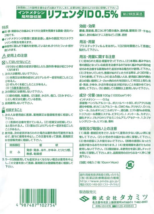 | (膏体100g(1000平方センチメートル)中) インドメタシン:0.5g 添加物:ベンジルアルコール、ポリソルベート80、ポリアクリル酸部分中和物、ポリビニルアルコール、CMC-Na、グリセリン、D-ソルビトール、カルボキシビニルポリマー、酒石酸、エデト酸ナトリウム水和物、トコフェロール酢酸エステル、ビタミンC、L-メントール、カオリン、酸化チタン、ジヒドロキシアルミニウムアミノアセテート、1、3-ブチレングリコール、ヒマシ油、香料 |