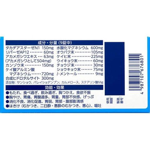 | 本剤は、淡灰褐色~淡褐色の素錠で、9錠中に次の成分を含有しています。 [成分:分量] タカヂアスターゼN1:150mg リパーゼAP12:60mg アカメガシワエキス:63mg(アカメガシワとして504mg) カンゾウ末:150mg ケイ酸アルミン酸マグネシウム:720mg 合成ヒドロタルサイト:300mg 水酸化マグネシウム:600mg オウバク末:105mg ケイヒ末:225mg ウイキョウ末:60mg チョウジ末:30mg ショウキョウ末:75mg l-メントール:9mg 添加物:サンショウ、バレイショデンプン、カルメロース、ステアリン酸Mg |