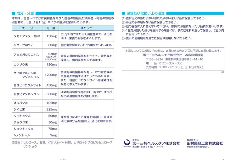 | 本剤は、白色~わずかに黄褐色を帯びた白色の顆粒及び淡褐色~褐色の顆粒の混合物で、3包(1包1.3g)中に次の成分を含有しています。 [成分:分量] タカヂアスターゼN1:150mg リパーゼAP12:60mg アカメガシワエキス:63mg(アカメガシワとして504mg) カンゾウ末:150mg ケイ酸アルミン酸マグネシウム:1200mg 合成ヒドロタルサイト:450mg 水酸化マグネシウム:600mg オウバク末:105mg ケイヒ末:225mg ウイキョウ末:60mg チョウジ末:30mg ショウキョウ末:75mg l-メントール:9mg 添加物:セルロース、乳糖、ポリソルベート80、ヒドロキシプロピルセルロース、サンショウ |