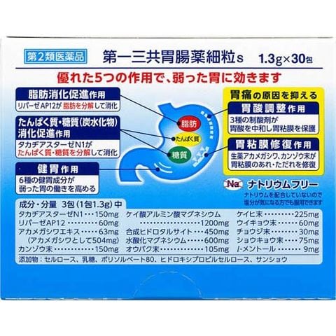 | 本剤は、白色~わずかに黄褐色を帯びた白色の顆粒及び淡褐色~褐色の顆粒の混合物で、3包(1包1.3g)中に次の成分を含有しています。 [成分:分量] タカヂアスターゼN1:150mg リパーゼAP12:60mg アカメガシワエキス:63mg(アカメガシワとして504mg) カンゾウ末:150mg ケイ酸アルミン酸マグネシウム:1200mg 合成ヒドロタルサイト:450mg 水酸化マグネシウム:600mg オウバク末:105mg ケイヒ末:225mg ウイキョウ末:60mg チョウジ末:30mg ショウキョウ末:75mg l-メントール:9mg 添加物:セルロース、乳糖、ポリソルベート80、ヒドロキシプロピルセルロース、サンショウ |
