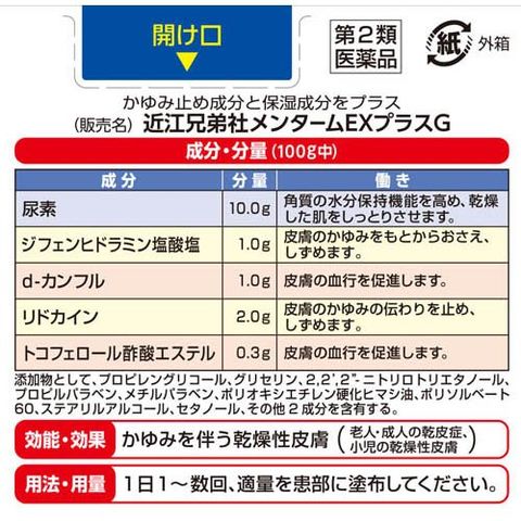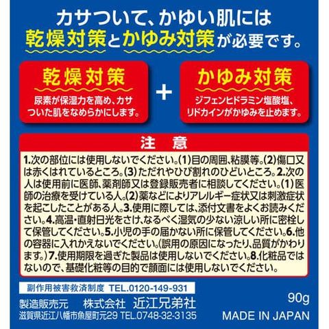 | (100g中に次の成分を含みます。) [成分:分量:働き] 尿素:10.0g:角質の水分保持機能を高め、乾燥した肌をしっとりさせます。 ジフェンヒドラミン塩酸塩:1.0g:皮膚のかゆみをもとからおさえ、しずめます。 d-カンフル:1.0g:皮膚の血行を促進します。 リドカイン:2.0g:皮膚のかゆみの伝わりを止め、しずめます。 トコフェロール酢酸エステル:0.3g:皮膚の血行を促進します。 添加物として、プロピレングリコール、グリセリン、2.2.2-ニトリロトリエタノール、プロピルパラベン、メチルパラベン、ポリオキシエチレン硬化ヒマシ油、ポリソルベート60、ステアリルアルコール、セタノール、カルボキシビニルポリマー、セバシン酸ジエチルを含有する。 |