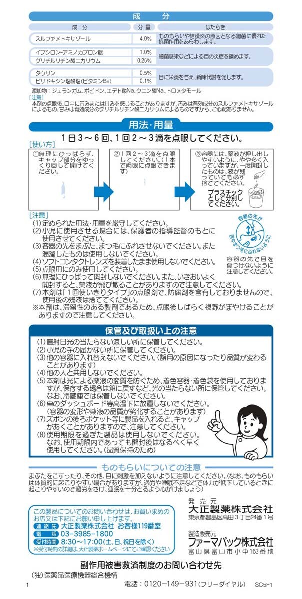 | [成分:分量:はたらき] スルファメトキサゾール:4.0%:ものもらいや結膜炎の原因となる細菌に優れた抗菌作用をあらわします。 イプシロン-アミノカプロン酸:1.0%:細菌感染などによる目の炎症を鎮めます。 グリチルリチン酸二カリウム:0.25%:細菌感染などによる目の炎症を鎮めます。 タウリン:0.5%:目に栄養を与え、新陳代謝を促します。 ピリドキシン塩酸塩(ビタミンB6):0.1%:目に栄養を与え、新陳代謝を促します。 添加物:ジェランガム、ポビドン、エデト酸Na、クエン酸Na、トロメタモール ★注意 本剤の点眼後、口中に苦みまたは甘みを感じることがありますが、苦みは有効成分のスルファメトキサゾールによるもの、甘みは有効成分のグリチルリチン酸二カリウムによるものですから、ご心配ありません。 |