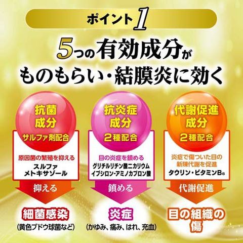 スルファメトキサゾール:4.0%:ものもらいや結膜炎の原因となる細菌に優れた抗菌作用をあらわします。