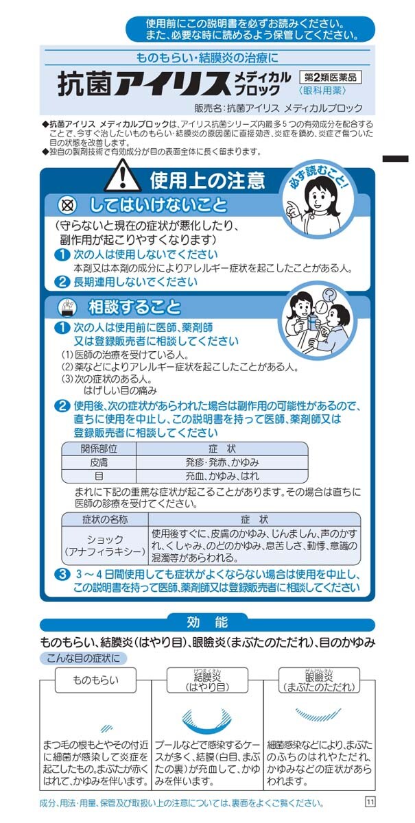 | [成分:分量:はたらき] スルファメトキサゾール:4.0%:ものもらいや結膜炎の原因となる細菌に優れた抗菌作用をあらわします。 イプシロン-アミノカプロン酸:1.0%:細菌感染などによる目の炎症を鎮めます。 グリチルリチン酸二カリウム:0.25%:細菌感染などによる目の炎症を鎮めます。 タウリン:0.5%:目に栄養を与え、新陳代謝を促します。 ピリドキシン塩酸塩(ビタミンB6):0.1%:目に栄養を与え、新陳代謝を促します。 添加物:ジェランガム、ポビドン、エデト酸Na、クエン酸Na、トロメタモール ★注意 本剤の点眼後、口中に苦みまたは甘みを感じることがありますが、苦みは有効成分のスルファメトキサゾールによるもの、甘みは有効成分のグリチルリチン酸二カリウムによるものですから、ご心配ありません。 |