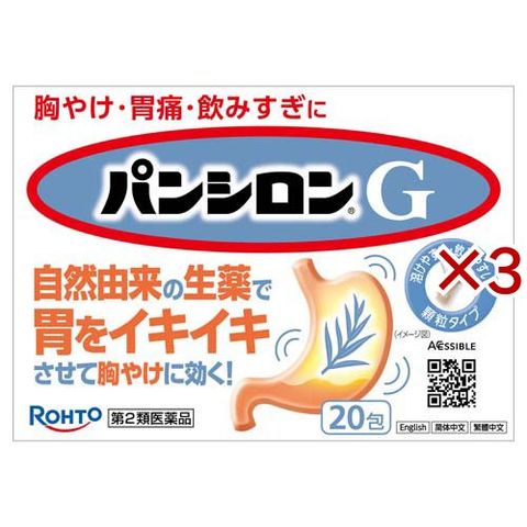 | ★有効成分と作用(3包中) [有効成分:配合量:作用] 粘膜修復剤:L-グルタミン:405mg:胃壁のただれや炎症に対して、胃の粘膜を修復し正常に戻す働きをします。 健胃生薬:桂皮(ケイヒ):150mg:胃のためによい生薬で、特有の芳香性や苦みを持つ健胃生薬です。消化液の分泌を促して、食欲の増進をはかると共に胃腸の働きをよくします。 健胃生薬:桂皮油(ケイヒ油):6mg:胃のためによい生薬で、特有の芳香性や苦みを持つ健胃生薬です。消化液の分泌を促して、食欲の増進をはかると共に胃腸の働きをよくします。 健胃生薬:縮砂(シュクシャ):90mg:胃のためによい生薬で、特有の芳香性や苦みを持つ健胃生薬です。消化液の分泌を促して、食欲の増進をはかると共に胃腸の働きをよくします。 健胃生薬:当薬(センブリ):3mg:胃のためによい生薬で、特有の芳香性や苦みを持つ健胃生薬です。消化液の分泌を促して、食欲の増進をはかると共に胃腸の働きをよくします。 制酸剤:炭酸水素ナトリウム:1950mg:胸やけなどに見られる過酸症状の緩和にすぐれた効き目のある速効性の制酸剤で、胃の中の酸度を早く一定に整え、消化剤の働きやすい状態を作ります。 制酸剤:重質炭酸マグネシウム:600mg:胸やけなどに見られる過酸症状の緩和にすぐれた効き目のある速効性の制酸剤で、胃の中の酸度を早く一定に整え、消化剤の働きやすい状態を作ります。 制酸剤:沈降炭酸カルシウム:300mg:胸やけなどに見られる過酸症状の緩和にすぐれた効き目のある速効性の制酸剤で、胃の中の酸度を早く一定に整え、消化剤の働きやすい状態を作ります。 制酸剤:サナルミン:399mg:制酸効果を長く保つ持続性制酸剤で胃の中の酸度を長く一定に整え、胃壁を保護します。 制酸剤:ロートエキス:30mg:胃液分泌抑制作用があり、制酸剤と組み合わせると胃酸中和効果が持続します。 消化剤:ジアスメンSS:240mg:炭水化物の消化を助け胃の負担を軽くします。 消化剤:プロザイム:51mg:タンパク質の消化を助け胃の負担を軽くします。 添加物:l-メントール、セルロース、ケイ酸Al、ステアリン酸Mg |
