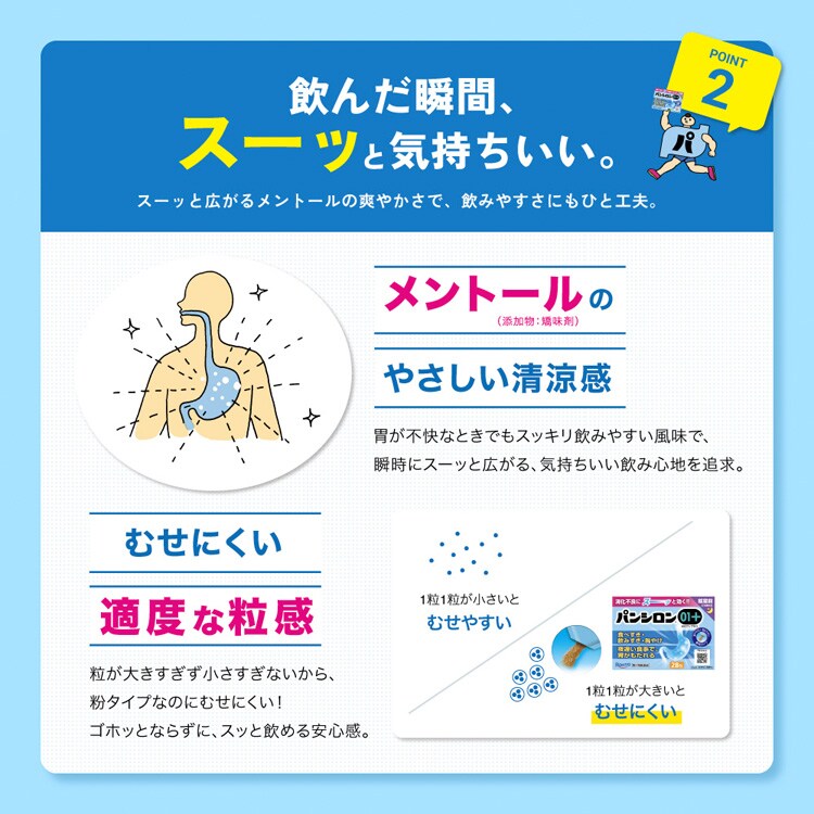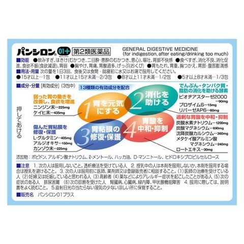 ●胃をスーッとさせる速効性制酸剤と持続性制酸剤、荒れた胃粘膜を整える粘膜修復剤と健胃剤、さらに消化を促進する消化酵素など、胃腸薬の基本機能に必要な有効成分をバランスよく配合しました。