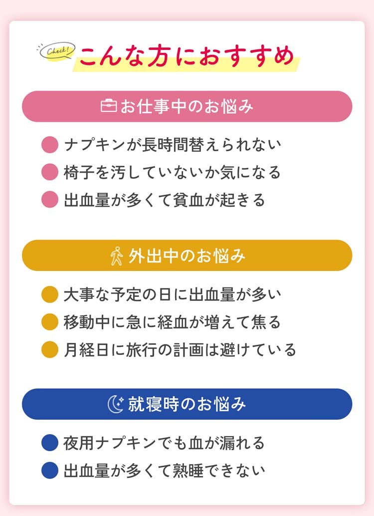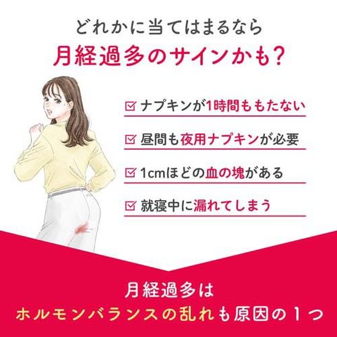 ●生理の時、昼なのに夜用ナプキンを使わないと漏れないか心配になるくらい、経血量が多くてつらい、月経過多の方のための医薬品です