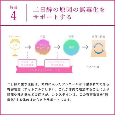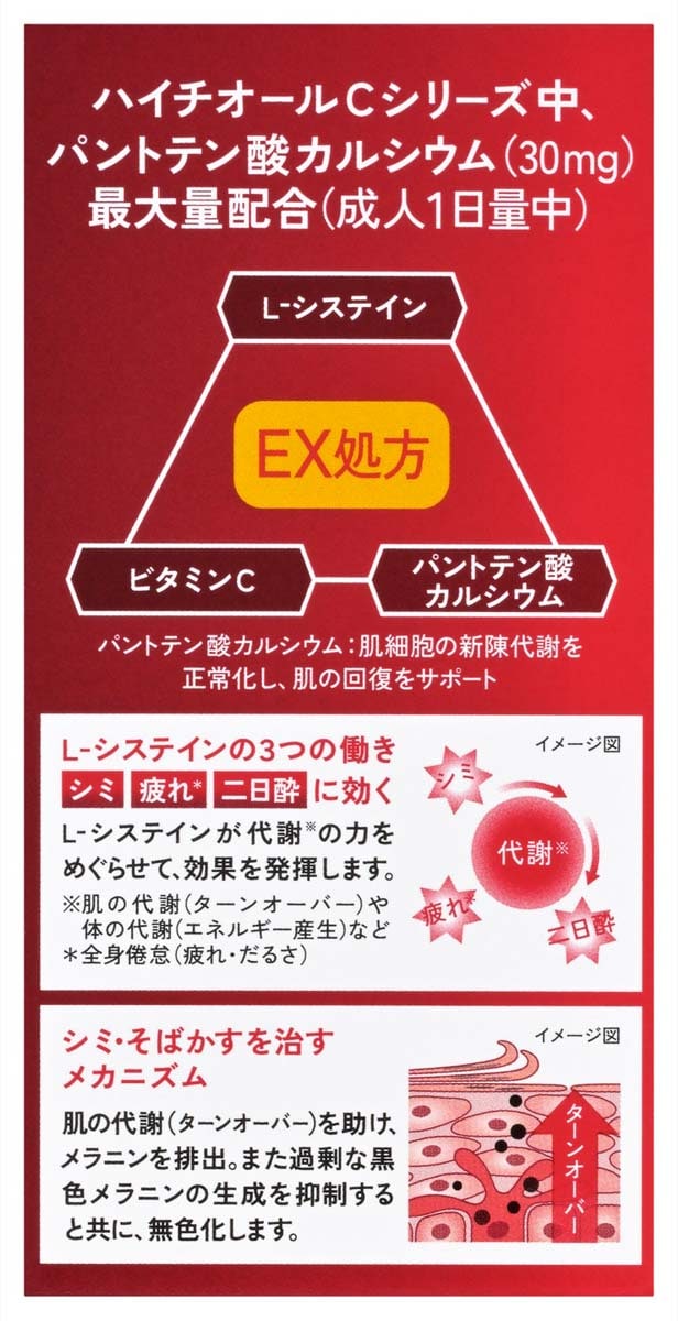 | 4錠(成人1日量)中 L-システイン:240mg アスコルビン酸(ビタミンC):500mg パントテン酸カルシウム:30mg 添加物:無水ケイ酸、セルロース、乳酸Ca、ヒプロメロース、ヒドロキシプロピルセルロース、マクロゴール、ステアリン酸Ca、タルク、酸化チタン、トウモロコシデンプン、酒石酸、ジメチルポリシロキサン、二酸化ケイ素、ポリビニルアルコール・アクリル酸・メタクリル酸メチル共重合体 |