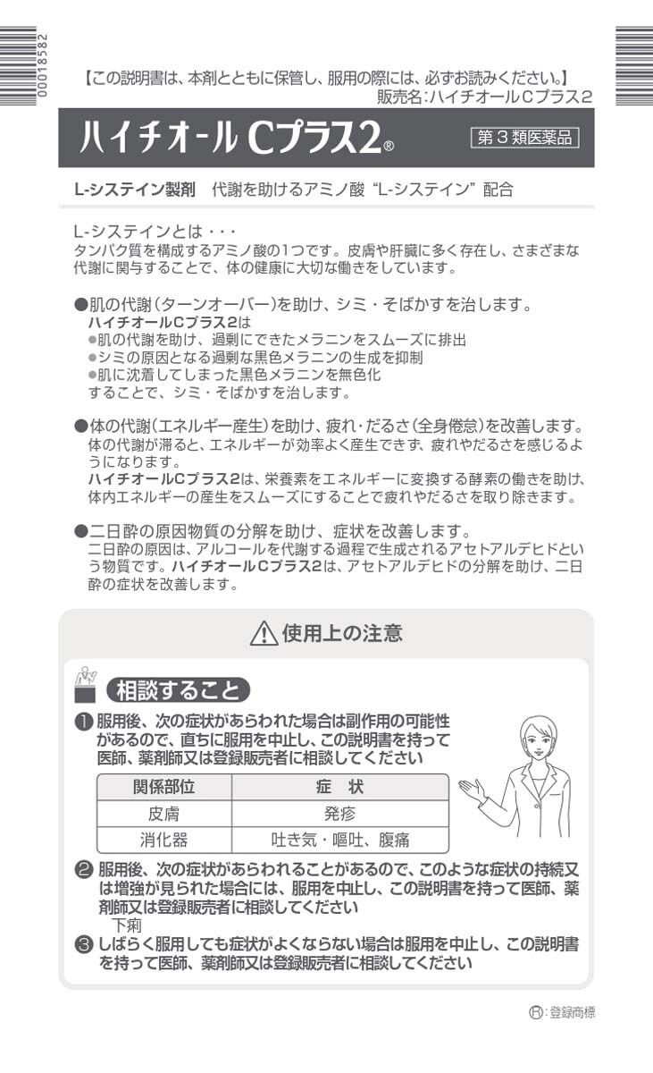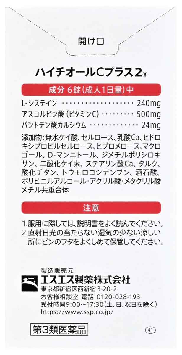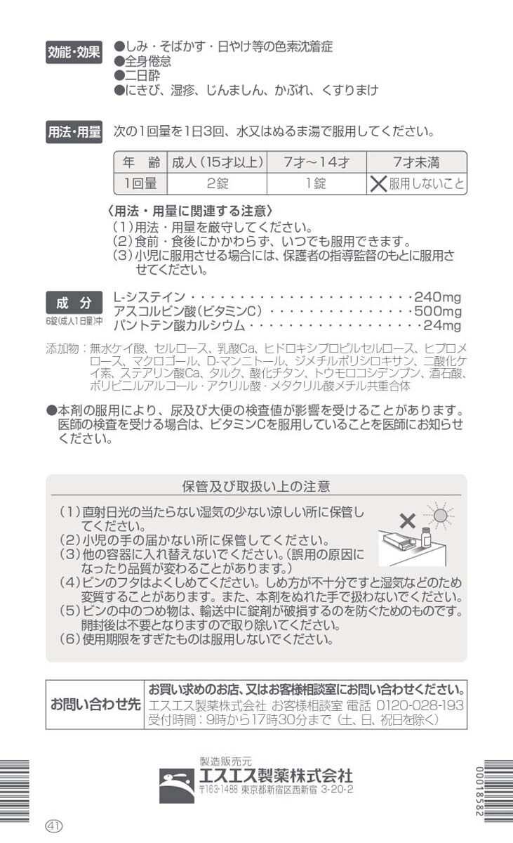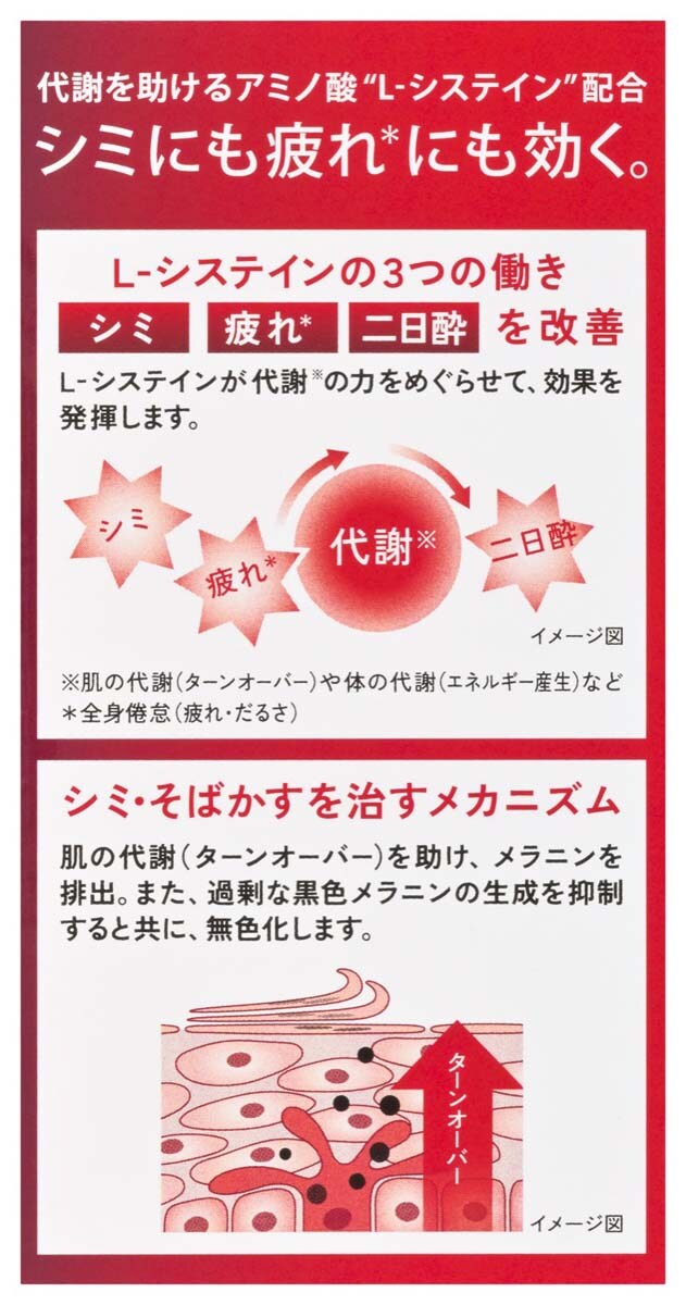 | 6錠(成人1日量)中 L-システイン:240mg アスコルビン酸(ビタミンC):500mg パントテン酸カルシウム:24mg 添加物:無水ケイ酸、セルロース、乳酸Ca、ヒドロキシプロピルセルロース、ヒプロメロース、マクロゴール、D-マンニトール、ジメチルポリシロキサン、二酸化ケイ素、ステアリン酸Ca、タルク、酸化チタン、トウモロコシデンプン、酒石酸、ポリビニルアルコール・アクリル酸・メタクリル酸メチル共重合体 |