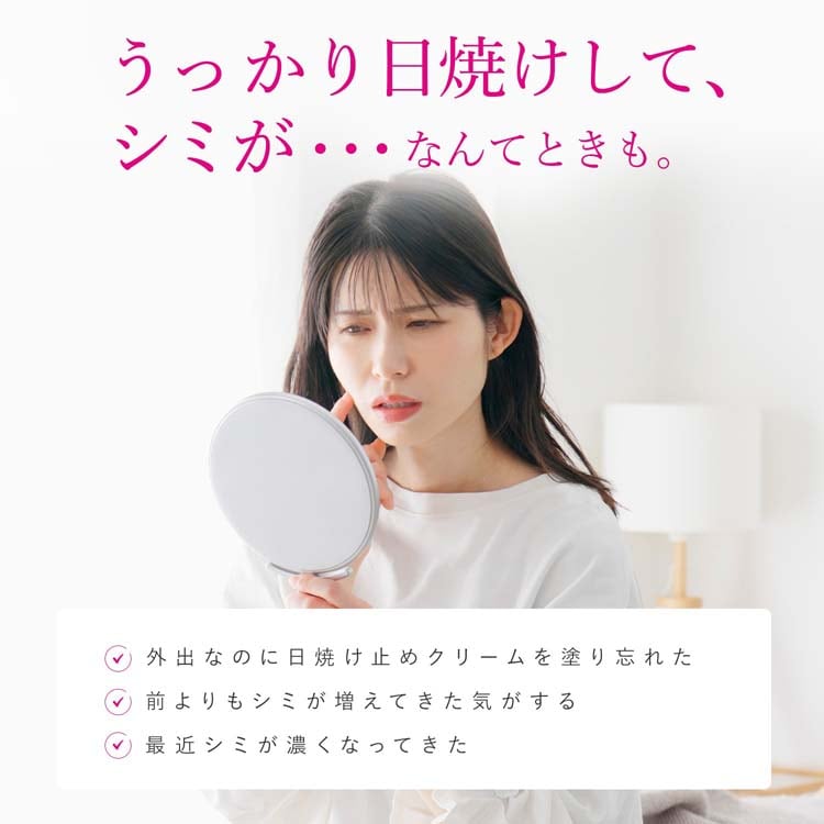 ●有効成分のL-システインがターンオーバー(肌の代謝)を正常化し、シミの原因である過剰にできたメラニンを排出。さらにビタミンCと協力して過剰な黒色メラニンの生成を抑制し、肌に沈着した黒色メラニンを無色化します。