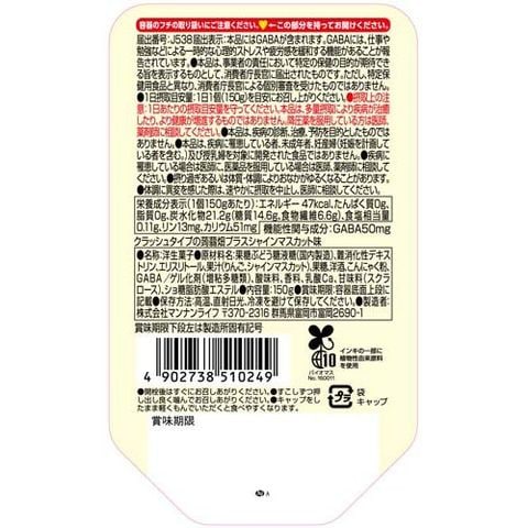 | 果糖ぶどう糖液糖(国内製造)、難消化性デキストリン、エリスリトール、果汁(りんご、シャインマスカット)、果糖、洋酒、こんにゃく粉、GABA/ゲル化剤(増粘多糖類)、酸味料、香料、乳酸Ca、甘味料(スクラロース)、ショ糖脂肪酸エステル |