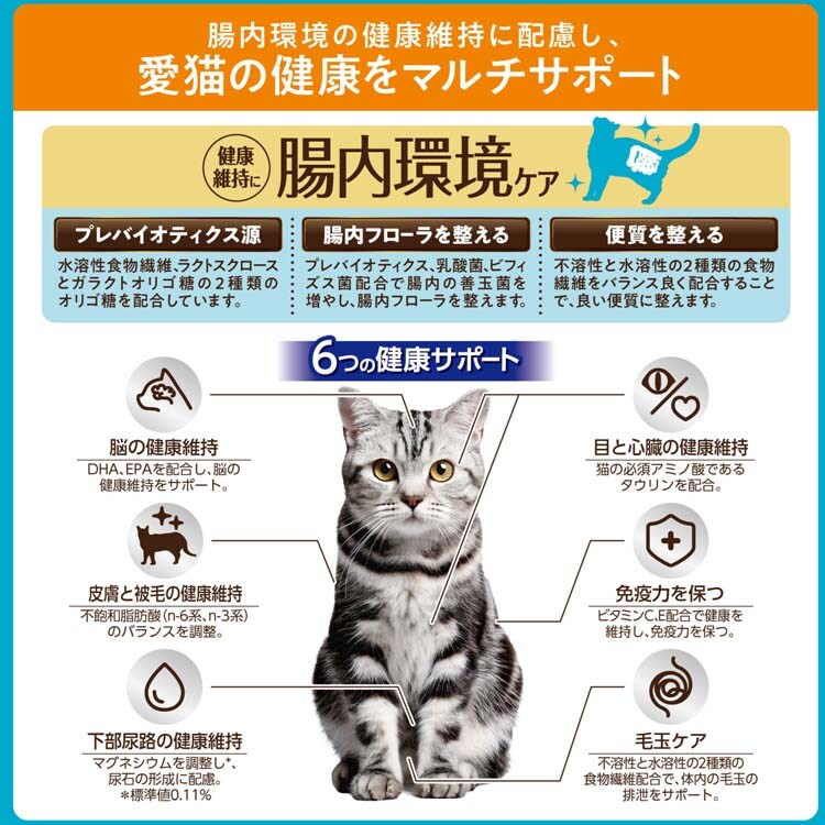 穀類(とうもろこし、コーングルテンミール、小麦粉)、肉類(チキンミール、チキンレバーパウダー、鶏ささみパウダー)、魚介類(ホワイトフィッシュミール、フィッシュエキス)※、動物性油脂、食物繊維(不溶性食物繊維、水溶性食物繊維)、糖類(ラクトスクロース、ガラクトオリゴ糖)、乳酸菌(殺菌)、ビフィズス菌(殺菌)、ミネラル類(Ca、P、K、Na、Cl、Fe、Cu、Mn、Zn、I、Co)、ビタミン類(A、D3、E、K3、B1、B2、B6、B12、ナイアシン、パントテン酸、葉酸、ビオチン、コリン、C)、アミノ酸類(メチオニン、タウリン)、酸化防止剤(ミックストコフェロール、ハーブ抽出物)※DHA、EPA源