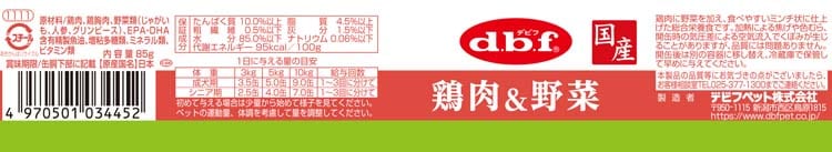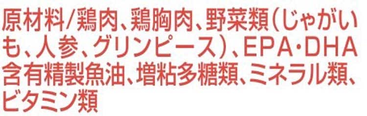 | 鶏肉、鶏胸肉、野菜類(じゃがいも、人参、グリンピース)、EPA・DHA含有精製魚油、増粘多糖類、ミネラル類、ビタミン類 |