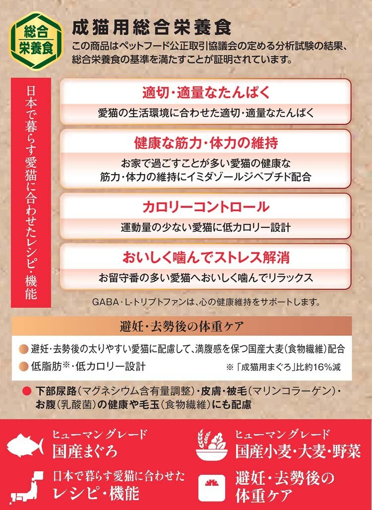 | 魚介類(まぐろ、フィッシュミール、フィッシュエキス、フィッシュパウダー、魚肉抽出物(イミダゾールジペプチド源として))、小麦、とうもろこし、植物性油脂、酵母、ポテトプロテイン、チキンミール、脱脂大豆、セルロース粉末(食物繊維源として)、チキンレバーパウダー、酵母細胞壁、フィッシュオイル、でん粉、大麦若葉、紫さつまいも、殺菌乳酸菌、マリンコラーゲン、GABA、ほうれん草、ケール、かぼちゃ、ビタミン類(A、D、E、K、B1、B2、B6、C、ナイアシン、葉酸、コリン)、アミノ酸類(メチオニン、トリプトファン、タウリン)、pH調整剤、ミネラル類(カリウム、鉄、亜鉛、銅、ヨウ素) |