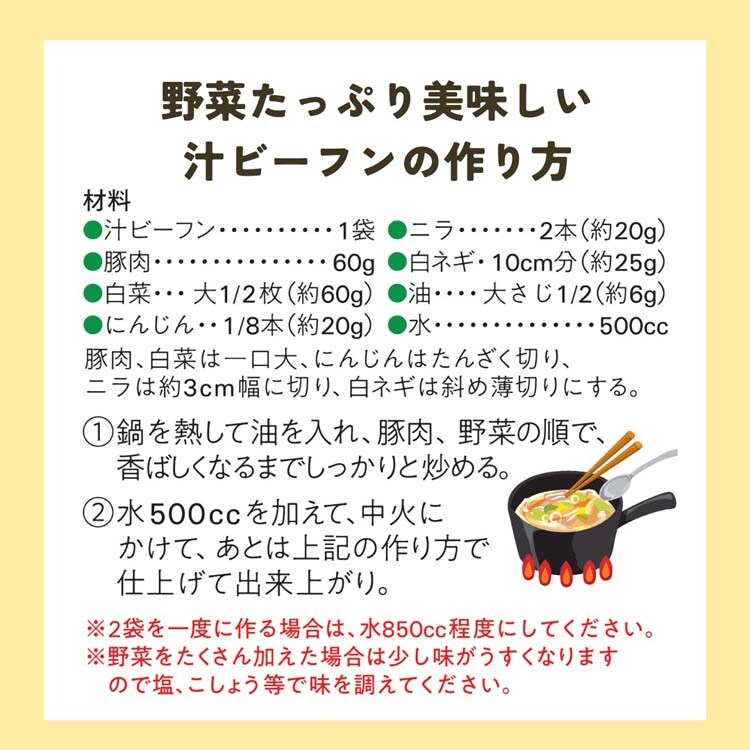・野菜をたくさん加えた場合は少し味がうすくなりますので塩、こしょう等で味を調えてください。