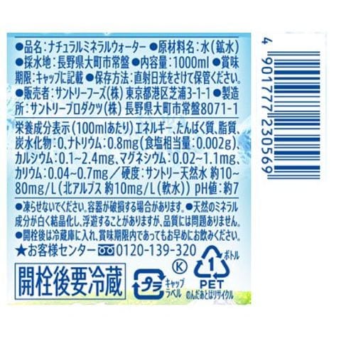 | 100mlあたり エネルギー:0kcal、たんぱく質:0g、脂質:0g、炭水化物:0g、ナトリウム:0.8mg(食塩相当量:0.002g)、カルシウム:0.1~2.4mg、マグネシウム:0.02~1.1mg、カリウム:0.04~0.7mg/硬度:サントリー天然水 約10~80mg/L(北アルプス 約10mg/L(軟水))pH値:約7 |