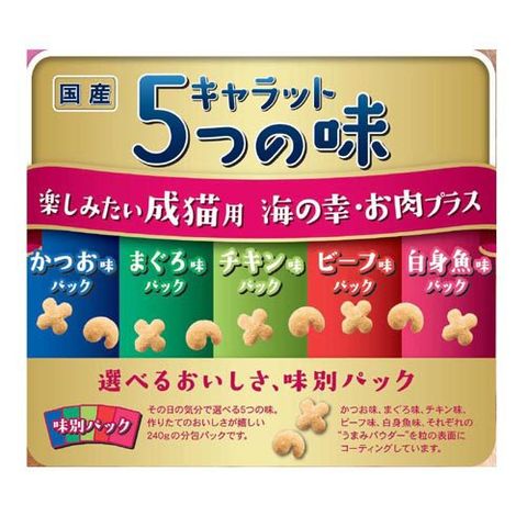 ・お魚やお肉の風味を楽しみたいねこちゃんにおすすめの240g分包、5つの味別パック。