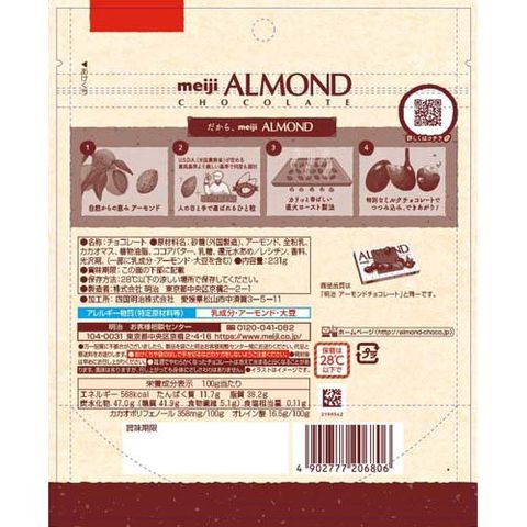 | 砂糖(外国製造)、アーモンド、全粉乳、カカオマス、植物油脂、ココアバター、乳糖、還元水あめ/レシチン、香料、光沢剤、(一部に乳成分・アーモンド・大豆を含む) |